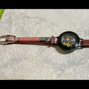Origami Owl plaid red, black & white strap with black face charm holder. 4 charms, yellow school bus, stack of books, apple and graduation hat. Strap signed