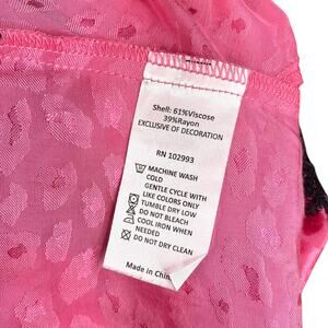 This by Koche is so cool! It is a pull on style with button at the back of neck creating small keyhole. Main fabric is a bubblegum pink leopard print jacquard, dress is trimmed in black scalloped lace. Dress has a free/shift style waist and asymmetric hem. No flaws, is in like new condition!