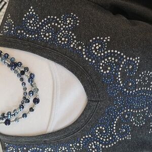 Stylish charcoal top featuring elegant blue embellishments. A perfect addition to your wardrobe for a touch of sophistication.
