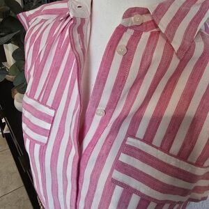 Stylish pink and white striped dress by Hugo Boss. Features short sleeves and button-up front. Perfect for casual outings.