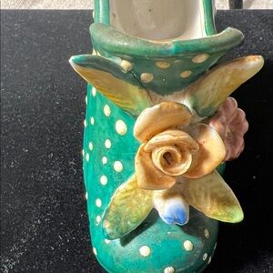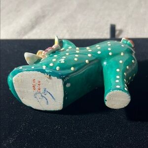 Charming women's shoe with a green polka dot design and floral accents. Vintage made in Japan with the original $.39 price on the bottom what do you want measures 4” long and 3.25” tall. I can’t decide if there is a flower missing on the left side. No evidence of it on the shoe.