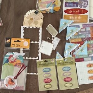 A lot of scrapbooking supplies. This includes some partially used packs of items. Some of the stickers have been opened and if the sticky isn’t working, you may need to add some tape runner glue. Everything is pretty much unusable condition to the best of my knowledge. there are unopened packs of stickers. There are some interesting items, such as some slide frames and a car license plate, cardboard heart shapes. There is an entire pack of creative memory, die cut hearts brand new in the packaging and there are 12 of them. The K and Company items are such lovely stickers and frames. There is plenty of scrapbooking stuff here or card making to create numerous pages.
