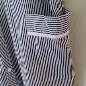 Stylish house dress with blue and white stripes. Features snap button up front and elegant design. Embroidery at neckline.