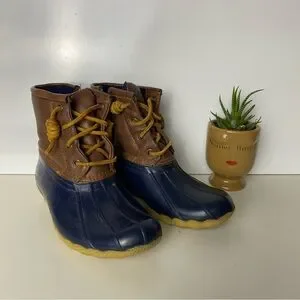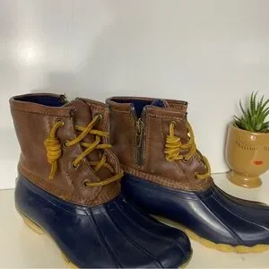 Stylish and durable, these kids' duck boots feature a brown and blue design. Perfect for outdoor adventures, they offer comfort and protection.