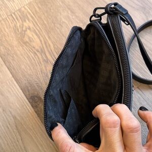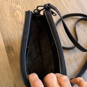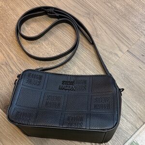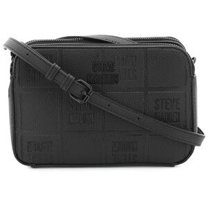 Stylish black crossbody bag with embossed logo. Perfect for modern fashion.