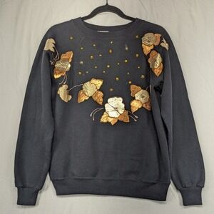 Keywords: vintage sweatshirt, Hanes Her Way, floral sweatshirt, gold embellishments, crewneck sweatshirt, retro fashion, embellished sweatshirt, casual chic, womens sweatshirt, medium sweatshirt, black sweatshirt, gold accent, sparkle, gems, unique sweatshirt
