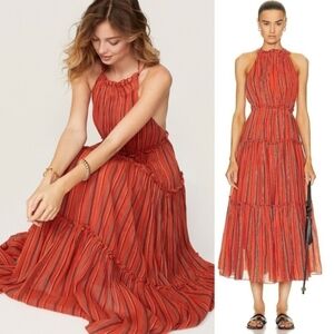 This elegant sundress by Ulla Johnson features a smocked bodice and a tiered maxi design, perfect for resort wear. The cream and tan hues create a sophisticated look, while the sleeveless halter neckline adds a touch of modern style.