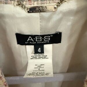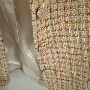 Elevate your wardrobe with this chic A.B.S. by Allen Schwartz tweed jacket. Crafted in a classic bouclé tweed with soft pastel tones of pink, cream, yellow, and subtle metallic threading, this piece offers timeless sophistication with a modern edge.