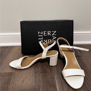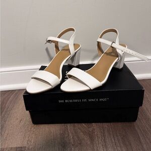 Chic white heels with a comfortable block design. Ideal for versatile styling.
