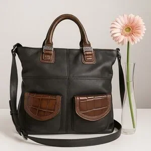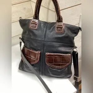 Gorgeous Brighton Collection leather tote in black with rich brown crocodile-embossed trim and signature engraved silver hardware. Features double top handles, a removable adjustable shoulder strap, two front flap pockets, and a back zip pocket. Inside features Brighton’s signature printed lining and an embossed authenticity patch.