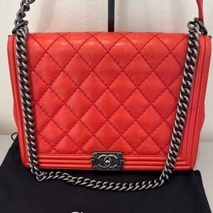 Gorgeous Chanel boy bag jumbo size Stylish red quilted design. Features gunmetal chain strap and hardware. Minor rubbing as shown otherwise great condition! Comes with Chanel dust bag and COA♥️