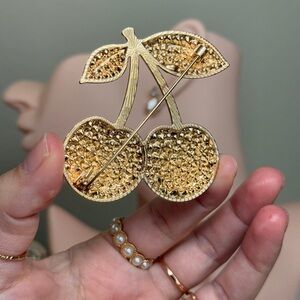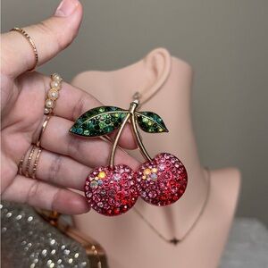 Charming cherry brooch with vibrant red and green crystals. Perfect accessory for a playful touch.