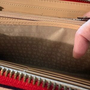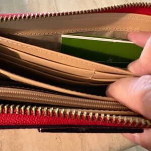 Zip around wallet from Kate Spade. Red with gold tone hardware. Pocket on back side of wallet. There are 3 line marks on the back of the wallet near the pocket (see photo). Interior zippered pocket, 2 bill pockets, 12 card slots, and a divided area. Lots if storage and the zipper closure keeps everything contained. Leather.