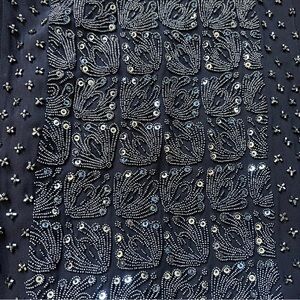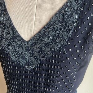 A breathtaking Tory Burch 100% Silk Beaded & Sequin Cocktail Dress in a deep, rich navy. The craftsmanship is unreal — delicate beadwork, shimmering sequins, and elegant pleating that moves beautifully. Truly a quiet luxury, old-money inspired piece that photographs even better in person.