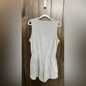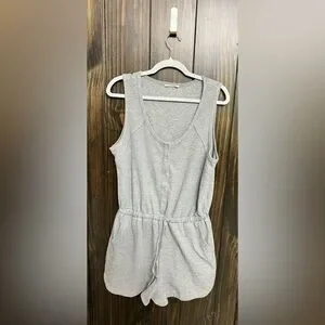 Stylish gray sleeveless jumpsuit with button-down front. Features a comfortable fit and elastic waist.