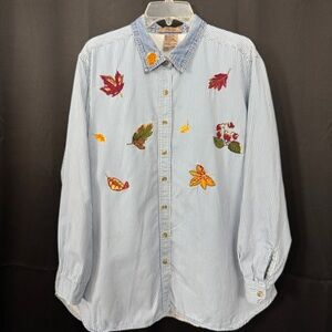 Playful fall-leaf embroidery pops against classic blue pinstripes with a soft denim-look collar. Relaxed button-front silhouette with long sleeves and a single-layer cotton build that wears easy for everyday or seasonal outfits.