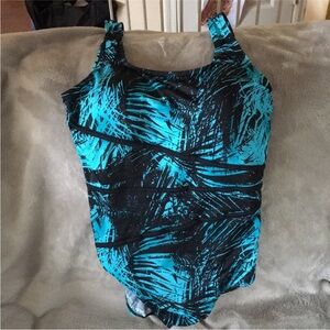 Stylish one-piece swimsuit. Features a vibrant blue and black pattern. Perfect for swimming or lounging.