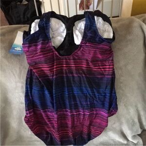 Classic one piece pink, purple and blue stripe on black. Soft shell bra. Aquabelle by swimsuits for all.
