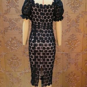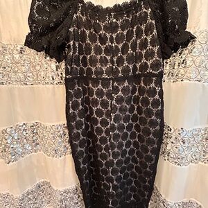 Adorable black lace cocktail dress. Perfect wedding guest dress. Can be worn on or off the shoulder. Worn once and lost weight. Fully lined and feels heavy, like it’s well made. For reference, I am 5’9” and was around 180 lbs when I wore it and it fit perfectly.