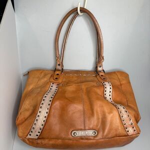 Stylish tan leather tote. Features studded accents. Durable handles. Perfect for everyday use. Note the water stains in pics, blends easily with the rustic design, but there’s visible use and wear so note in pictures… this is the condition of this awesome bag!