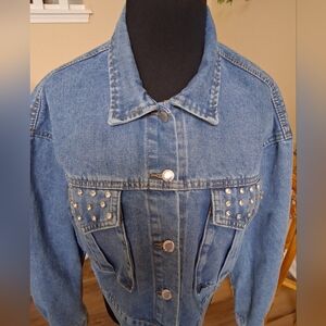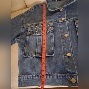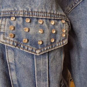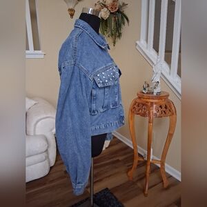 Classic denim jacket with faux crystal studs detailing on chest pockets. By Nali Collection. Features traditional collar and button front closure. Cropped style with structured silhouette. Front patch pockets add functional style. Oversize with ample room in the sleeves. Sized Small/Med