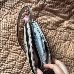 Stylish Kate Spade crossbody with Minnie Mouse design. Features black and tan colors. Ideal for adding fun to any look.