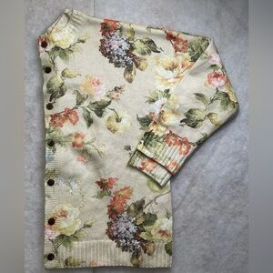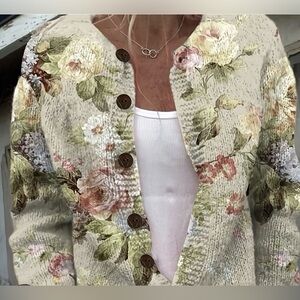 Embrace elegance with this floral knit cardigan sweater. Featuring a beautiful blend of cream and green hues, this sweater is perfect for adding a touch of nature-inspired style to your wardrobe. Ideal for layering, it offers both comfort and sophistication.