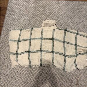World Market plaid cowl neck poncho sweater in a soft cream and oatmeal tone with subtle sage green windowpane plaid. Features a chunky cowl neckline, relaxed draped fit, fringe hem, and cozy textured knit fabric. One size fits most with an oversized poncho-style silhouette, perfect for layering over denim, leggings, or dresses. Neutral boho style ideal for fall, winter, and early spring wear.