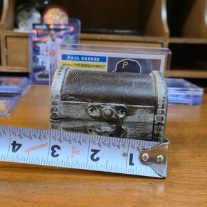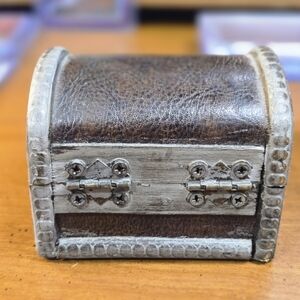 Small wooden treasure chest with leather-covered exterior and metal latch. Hinged lid opens and closes smoothly. Measures approx. 3 inches wide. Light wear from use. Great for jewelry, coins, or keepsakes. See photos for exact item and condition!