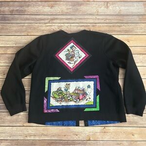 Vibrant cardigan with colorful patchwork design. Features blue, pink, green, and black hues. Custom made.