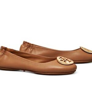 Elegant Tory Burch flats in a rich brown shade. Features a signature logo accent. Ideal for versatile styling.