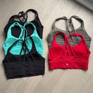 Selling as a set. All are long line energy bras in size 8. Gently used but all are in like new condition. Selling because I have so many and I never reach for these ones. Hope someone else gets good use of them.