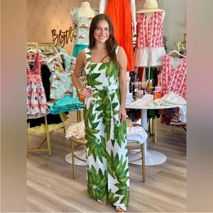 Vibrant jumpsuit with bold leaf pattern. Features a flattering fit and wide straps. Perfect for a stylish, tropical look. One of the best features of this beautiful jumpsuit is the snaps that it has from the straps to the chest and back portion to keep it in place. Contrast piping is gorgeous and such a nice detail. Matching belt sash tie included. Brand new with tags. Just stunning, but unfortunately, it doesn’t fit me. Looking to find her a happy home! Size extra large and would likely fit a 12 or 4.