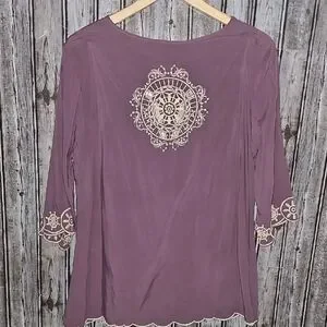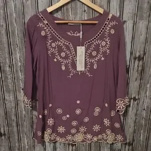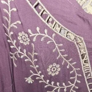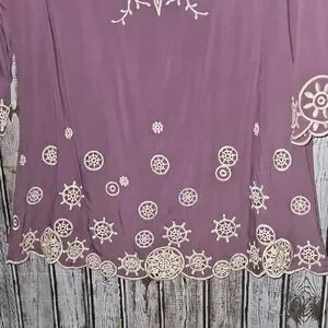 Elegant dusty plum boho tunic top, featuring intricate white embroidery. Perfect for a beach day or a date night.