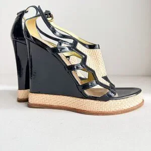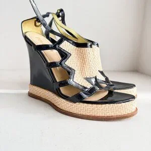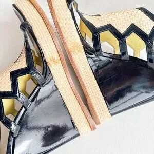 Pollini Raffia Patent Leather Navy Blue Wedge Summer Heels 40.