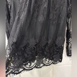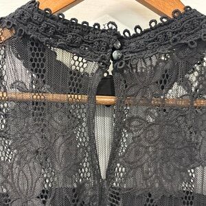 Ultra Pink women’s long sleeve lace top with Victorian style mock neck that buttons in the back. It is black and a size medium. The lace has a floral design, very romantic/Whimsigoth style. It is in excellent condition. It is lined from the chest down but the sleeves and shoulders are sheer.