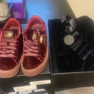 Elegant burgundy velvet sneakers by Puma. Great condition with box and dust bag