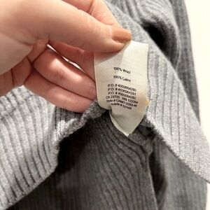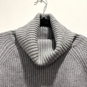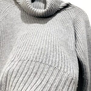 A Wilfred Free staple made with Italian merino wool, this ribbed-stitch sweater is soft, warm and absolutely essential. Great preowned condition, size XXS. This light gray cozy rib knit sweater features raglan sleeves, a cozy oversized cowl neck turtleneck, and a hi low hem, perfect to reduce bulk and avoid having to tuck the front of your sweater