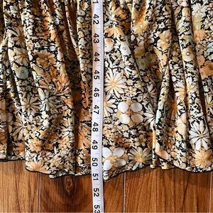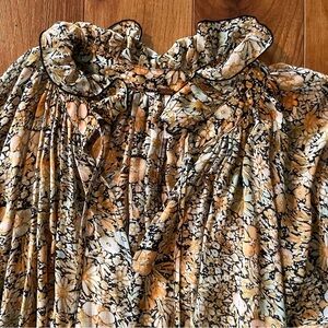 100% poly, lining is 100% viscose with snap button attachment, lightweight flowy material, voluminous long sleeves with cinched ruffle cuffs, oversized, maxi silhouette, full tiered a line skirt, v neckline with adjustable tie detail, minimally worn, approx measurements shown