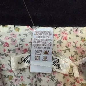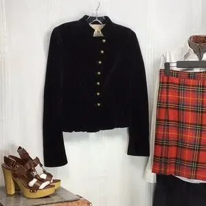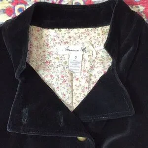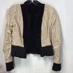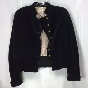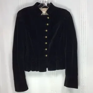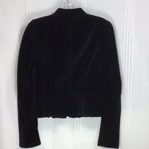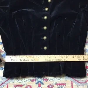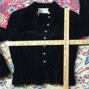 Vintage American Rag Black cotton velveteen cropped jacket, fitted waist and a pleated ruffle hemline, button front, lined in petite floral pattern and antiqued brass metal buttons, beautifully detailed inside and out, Nehru collar, extra long sleeves, cuffs can be turned up, Perfect for all occasions.