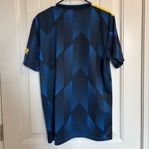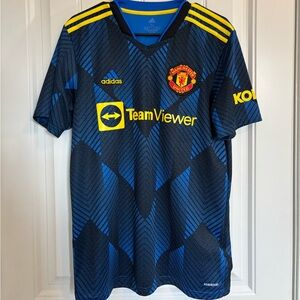 Blue and black jersey with yellow accents. Features Adidas logo and Manchester United crest.