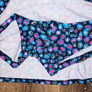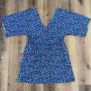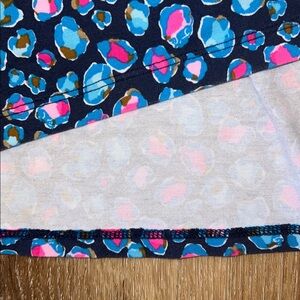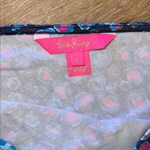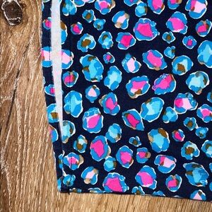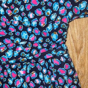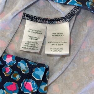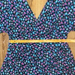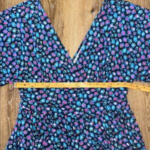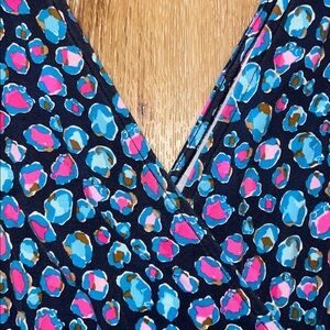 This beautiful Lilly romper is in excellent condition—only a very slight indication of wash wear. Please see the close up photos to see the great quality of the seams and stitches and the vibrant color of the fabric (94% rayon/6% spandex).