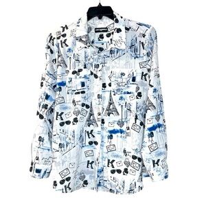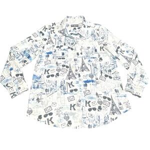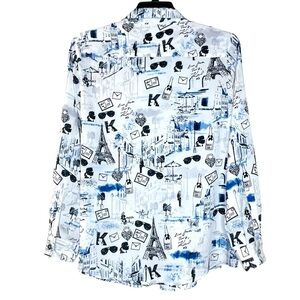Chic L Karl Lagerfeld Paris button-down shirt featuring a whimsical Parisian-themed print in blue and white. The pattern includes iconic elements like the Eiffel Tower, city scenes, envelopes, sunglasses, and the signature 'K' motif throughout. Long sleeves with button cuffs and a classic collar design. In excellent used condition.