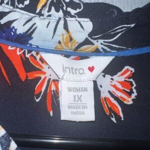 Chic floral button-up shirt with vibrant navy, orange, and white hues. Perfect for casual wear.