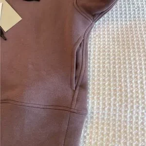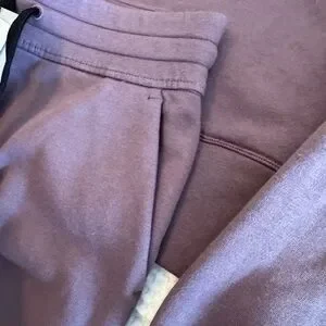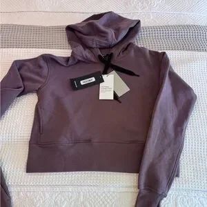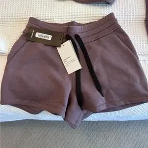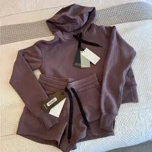 Cozy purple hoodie and shorts set with black drawstrings. Perfect for casual wear.