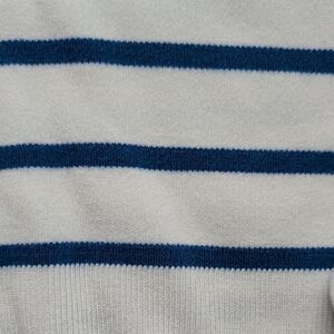 Stylish cream sweater with blue stripes. Features a V-neck and button detail. Perfect for casual outings.