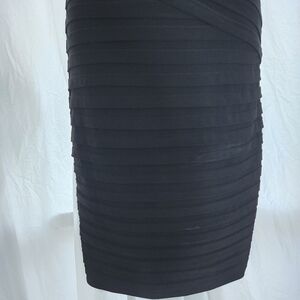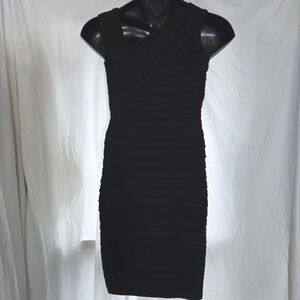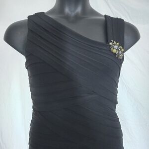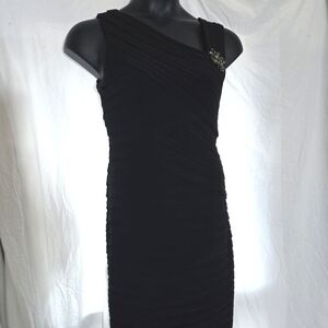 Gorgeous bandage style ruched dress with one strap design and jeweled embellishment. Black with golden jewel accent. below the knees design, sleeveless. It's a show stopping jaw dropping fit. Really stunning