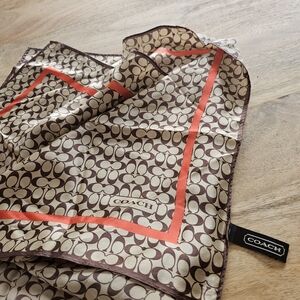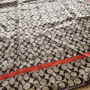 COACH 100% silk scarf. Stylish brown scarf with a bold red pattern. Perfect for adding a touch of elegance.