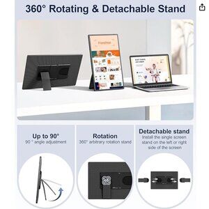 Enjoy a truly expansive view with this 16-inch 1920×1200 IPS portable monitor for laptop. Featuring 300 nits brightness, 100% sRGB color accuracy, and a 178° wide viewing angle, it delivers vibrant, true-to-life visuals from any angle. The laptop screen extender anti-glare matte screen with low blue light technology ensures comfortable, flicker-free viewing for long hours of work or play. This portable monitor is just 0.3 inches thin and weighs only about 1.5 lbs, as light as a water bottle, making it easy to slip into any bag. The included PU leather protective cover safeguards the screen from scratches and doubles as a convenient mouse pad, adding extra convenience for travel. Enjoy a larger screen experience anywhere, allowing you to work, study, or enjoy entertainment without the bulk of a traditional monitor. This travel monitor is designed for maximum flexibility, featuring a detachable stand with 360° rotation that allows effortless switching between landscape and portrait modes. Screen extender perfect for a variety of tasks—review contracts vertically, compare spreadsheets side by side, or enjoy videos at the ideal angle. Please make sure your laptop is equipped with a full-function Type-C port (Thunderbolt 3.0/4.0 with DisplayPort support and video output). In that case, you can simply connect via a single USB-C cable. Compatible with a wide range of devices, including Windows, Chrome, Mac, Android, Linux, DeX, and Switch.