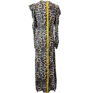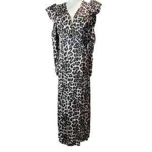 Farm Rio Leopard Print Midi Dress Long Sleeve Ruffle Shoulder Plunge V-Neck Sz S